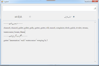 شاکر القادری صاحب کے تعاون سے القلم اردو انگریزی لغت کا ڈیٹا مجھے مل گیا تھا۔ اسے بھی اس میں ڈال دیا ہے۔ اس کے ساتھ ڈاٹ نیٹ کا ورژن بھی 2 کرنے کی کوشش کی تھی، کامیاب ہوئی یا نہیں کے بارے میں کچھ نہیں کہا جا سکتا۔ اگر ڈاٹ نیٹ 2 پر نہ چلے تو تین انسٹال کر کے چلا لیں۔ اور ایک وضاحت لغت میں *اعراب* والے الفاظ *اعراب کے بغیر* ٹائپ کریں ورنہ تلاش نہیں ہو گی۔ اس کی وجہ تلاش کی تکنیک کی خامیاں تھیں، چناچہ اعراب کو اڑانا پڑتا ہے، تاہم شو کرواتے ہوئے اعراب نظر آتے ہیں۔ اسکرین شاٹ ملاحظہ ہو۔