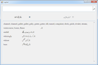 سی شارپ میں لکھی گئی ہے۔ اور بڑا سادہ سا کام ہے۔ اردو حرف دیں تو پہلے تو یہ حرف بحرف انٹری دیکھے گی۔ اگر ہوئی تو پہلی انٹری وہی شو ہو گی۔ اس کے بعد تلاش کردہ لفظ سے شروع ہونے والے تمام اندراجات سامنے نکال کر رکھ دے گی۔ دوسرا آپشن "حرف بحرف" پہلے کا ہی آدھا ورژن ہے، یعنی اگر حرف بحرف ملتے لفظ ہوئے تو کچھ ملے گا ورنہ چھٹی۔ نبیل نقوی کے تیارہ کردہ اردو ڈاٹ نیٹ کنٹرولز کو استعمال کرتے ہوئے اردو لکھنے کی سہولت دی ہے۔ باقی سادہ سا انٹرفیس ذاتی تیار کردہ ہے۔ لغت اطلاقیہ سی شارپ میں لکھا گیا ہے، ونڈوز سیون 64 بٹ اور شارپ ڈویلپ ورژن 4۔ اس پوسٹ کے ساتھ اس کی ایگزی فائل اور سورس پراجیکٹ شامل ہیں۔ اگر ایگزی نہ چلے تو خود سے کمپائل کر لیں۔ لغت کا فونٹ جمیل نوری نستعلیق ہے، چناچہ بہتر ہے کہ فونٹ بھی انسٹال ہو۔